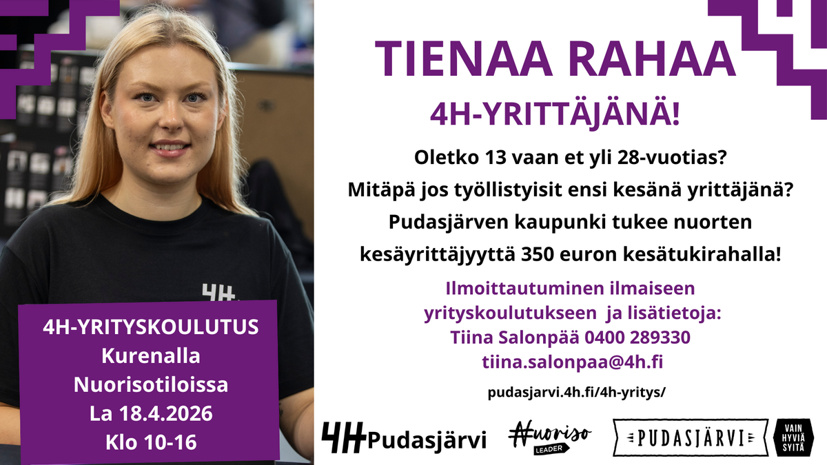 4H-YRITYSKOULUTUS KURENALLA NUORISOTILOISSA LA 18.4.2026 KLO 10-16!